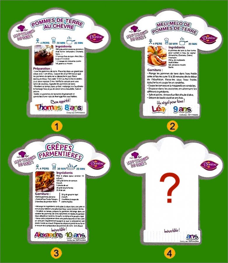Il existe 4 magnets dans cette série, mais nous ne connaissons pas le visuel du magnet N°4, si vous l'avez en votre possession, merci de nous le fournir1 : Pommes de terre au chèvre, Thomas 8 ans