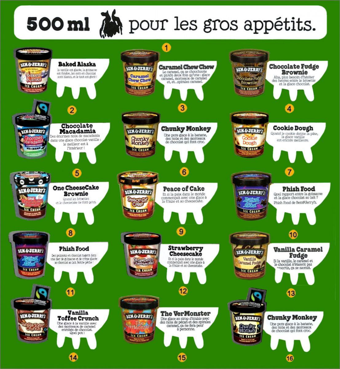 Ben & Jerry's : 1 à 16 (suivre la numérotation sur l'image)