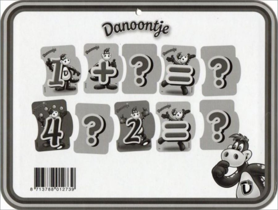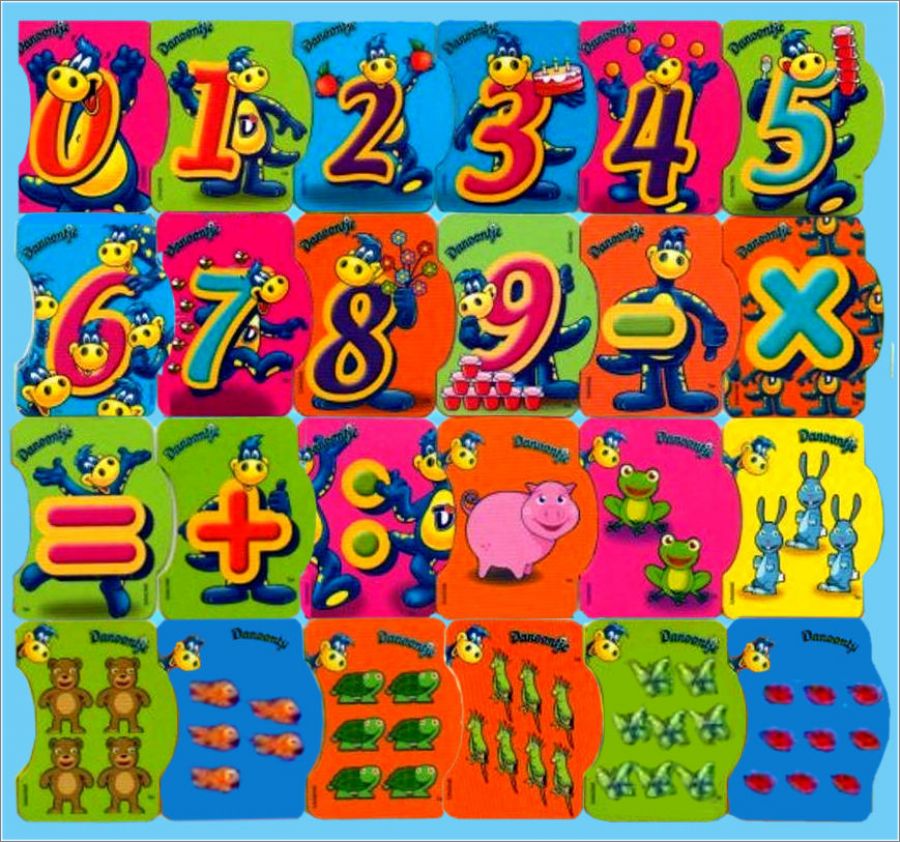 Danoontje Danone : 0, 1, 2, 3, 4, 5, 6, 7, 8, 9, - (moi), x (mul), = (ega), +(plu), : (div), 1Coc (cochon), 2Gre (grenouille), 3Lap (lapin), 4Our(ours), 5Poi (poisson), 6Tor (tortue), 7Per (perroquet), 8Pap (papillon), 9Coc (coccinelle)