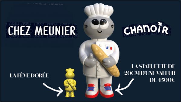 Une fève unique et dorée sera à retrouver dans l'une des 35 000 galettes créées pour l'occasion et vous permettra d'avoir accès à une œuvre grandeur nature en résine de 20 cm, d'une valeur de 4 500 euros, réalisée et signée par Chanoir lui-même.