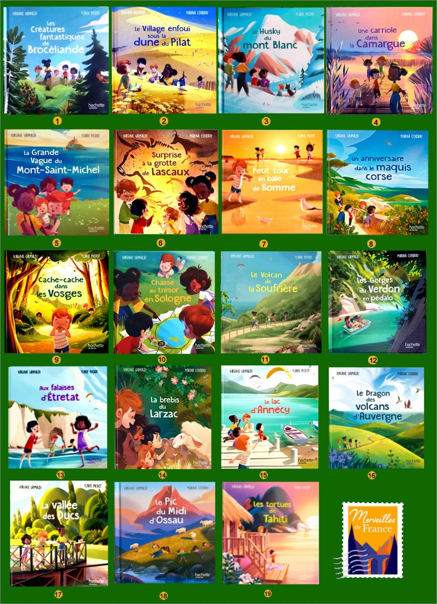 « Merveilles de France » !Grâce à l'écriture chaleureuse et vivante de Virginie Grimaldi et aux illustrations poétiques de Flavie Pichot et Marina Coudray, petits et grands lecteurs vont pouvoir suivre cinq cousins, unis comme les doigts de la main, dans leur découverte de sites merveilleux nichés au cœur des régions françaises. Aventures, rencontres et enquêtes vont rythmer les périples de cette tribu familiale, à travers 19 histoires mettant en avant, parmi tant d'autres, la forêt de Brocéliande, la dune du Pilat, le Mont Blanc, le volcan de la Soufrière, le Mont Saint-Michel, les Vosges ou encore la Camargue. Et dans la continuité des éditions précédentes, Petit Dragon remplace Pilou dans le « cherche et trouve » que les jeunes lecteurs affectionnent tant. Virginie Grimaldi, nouvelle autrice de la collection de livres Happy Meal™ 2023 de McDonald's France !