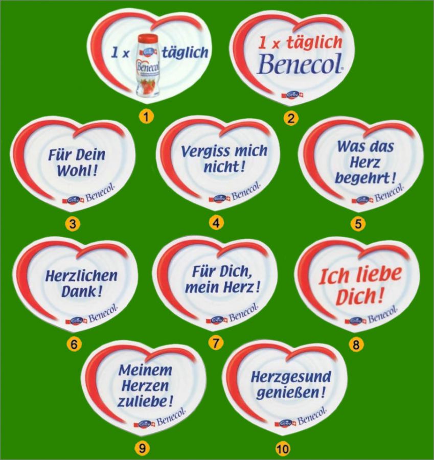 2 : 1 x täglich Benecol (1 x par jour Benecol)