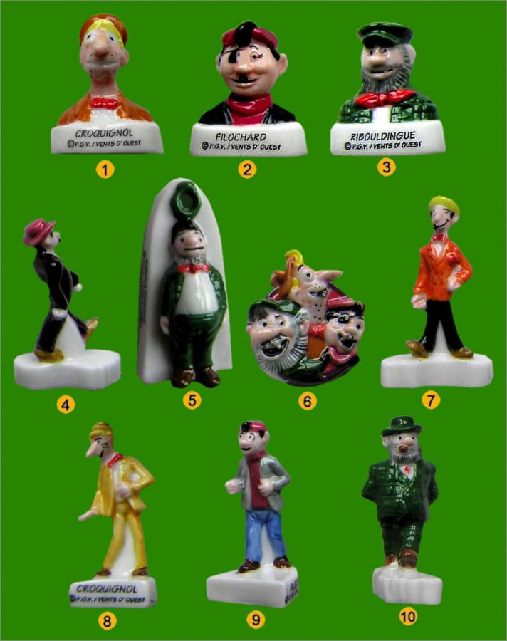 Série de fèves tirée de la BD Les Pieds Nickelés, principaux personnages Croquignol, Filochard et Ribouldingue