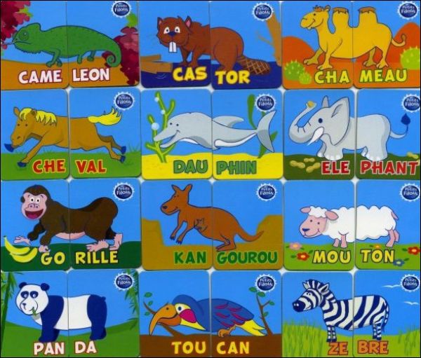 Caméléon = Cam Castor = Cas Chameau = Cha Cheval = Che Dauphin = Dau Éléphant = Ele Gorille = Gor Kangourou = Kan Mouton = Mou Panda = Pan Toucan = Tou Zébre = Zeb
