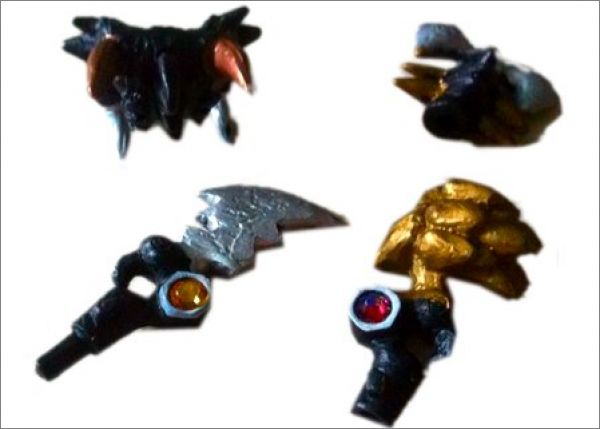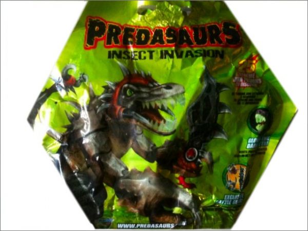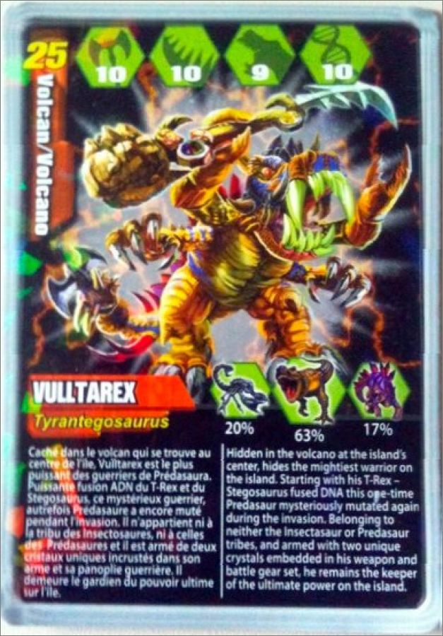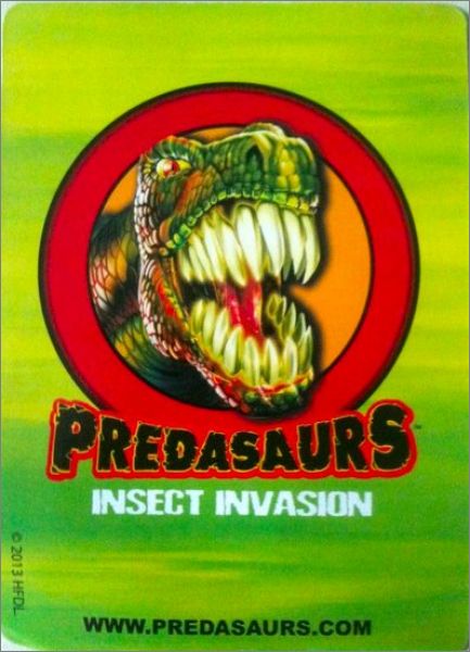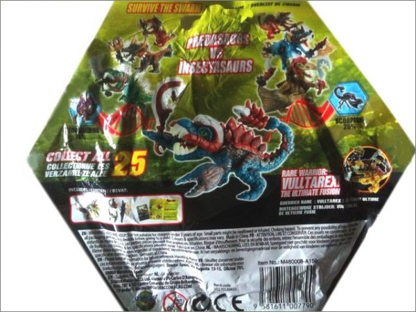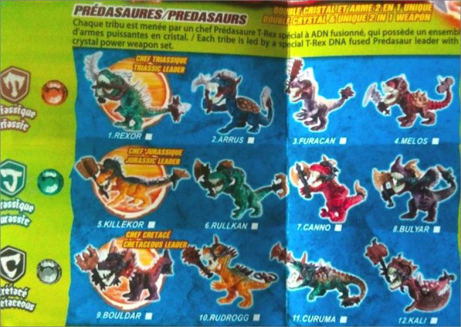 Prédasaurs Insect Invasion " . Il y a 25 figurines à collectionner (avec 2 armes et 1 casque) 6 clans de 4 figurines dont 1 Chef. Et une Figurine rare ( 3 armes dont 2 avec cristaux et 1 casque ) du coup 25 cartes a collectionner 7 à effets brillant et 18 normales. Les chefs sont des figurines Spéciales car sur leurs armes il y a un petit cristal de la couleurs du clan.Les figurines font entre 7 et 9 cm.