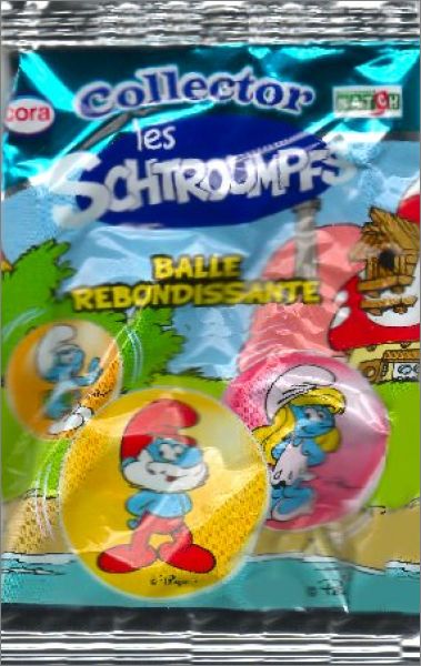 Le Collector Les Schtroumpfs - Cora - Match - 2013 - BallesLes pochettes du Cora sont bleues, elles contiennent 3 images + 1 carte (1 pochette par tranche de 30 euros d'achat - 1 balle par tranche de 80 euros)