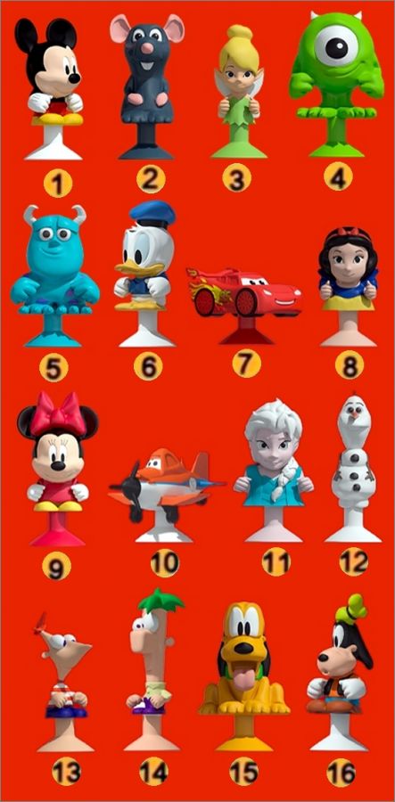 Vive la cuisine! 15 Micro popz Disney - Simply Market - 2015Les figurines sont identique sauf Clochette, Blanche Neige et Minnie qui ont le pouce levé et non le poing fermé