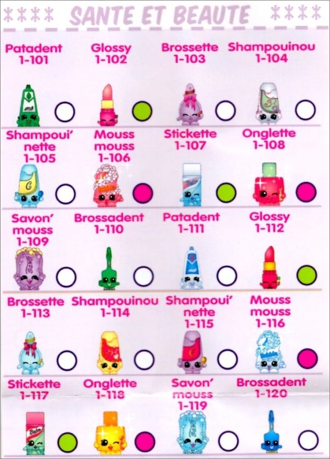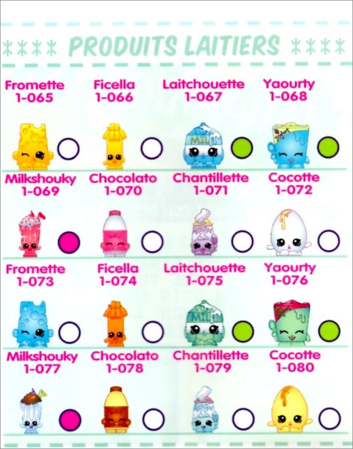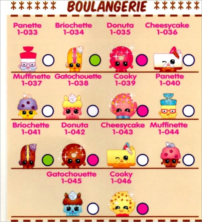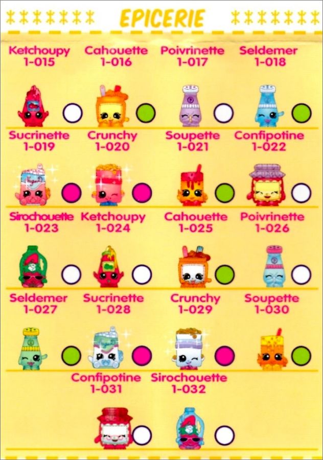 Shopkins rare (rond vert) *rar : Fru3, Fru10, Epi16, Epi18, Epi21, Epi25, Epi27, Epi30, Bou34, Bou41, Con47, Con48, Con49, Con50, Con52, Con54, Con56, Con57, Con58, Con59, Con61, Con63, Lai67, Lai68, Lai75, Lai76, Fet81, Fet82, Fet89, Fet91, Fet92, Fet99, San102, San107, San112, San117