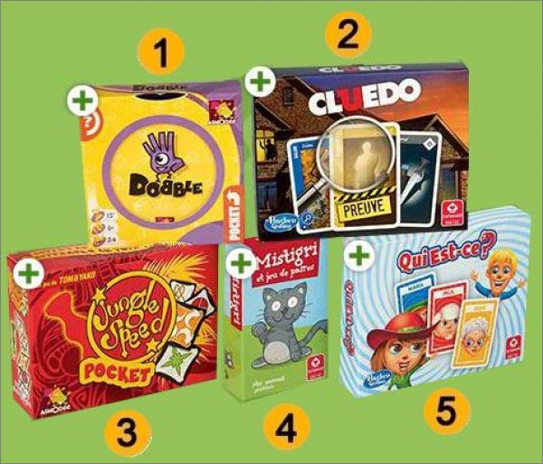 1 jeu de société offert pour l'achat simultané d'un Menu Best of ou Maxi Best of ou Menu Salade ou Menu McFirst et d'un Menu Happy Meal™. A choisir parmi une sélection de 5 jeux selon disponibilité en restaurant : Dobble, Cluedo, Jungle Speed, Mistigri, Qui-est-ce?
