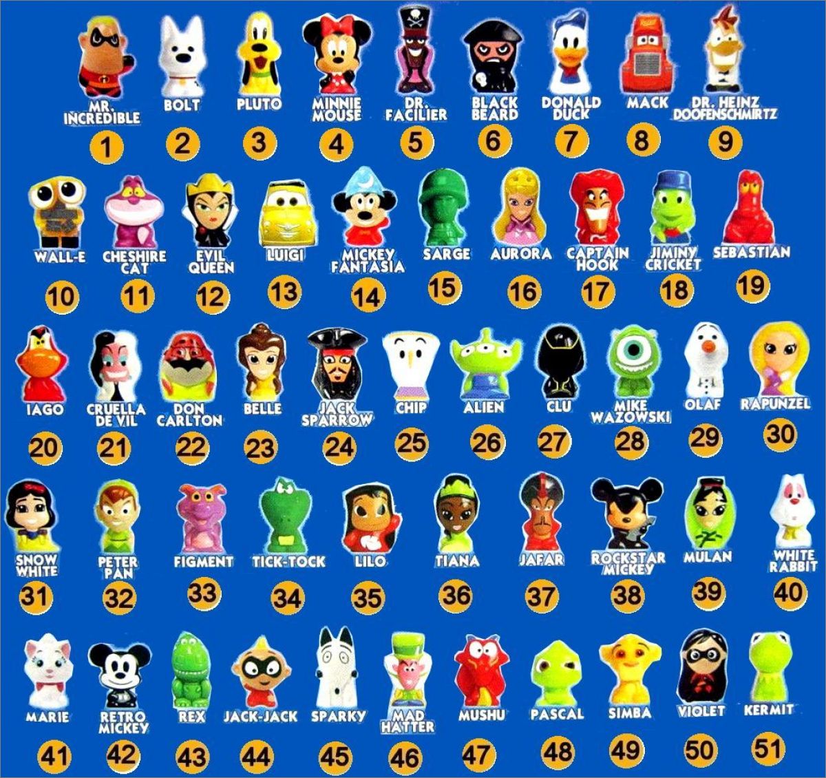 Figurines : 1 à 51, 4G, 10G, 27G, 38G, 42G (G = Gold) (Suivre la numérotation sur l'image)