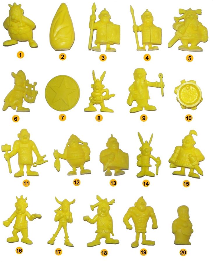 Il existe 20 figurines différentes mais pour chaque figurine il existe 7 couleurs différentes : vert, rose, jaune, bleu, orange, rouge et mauve.