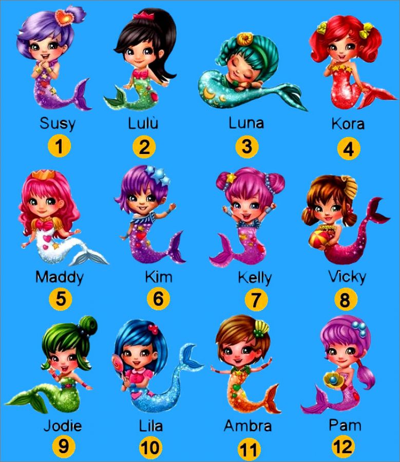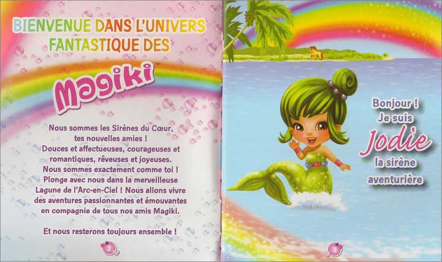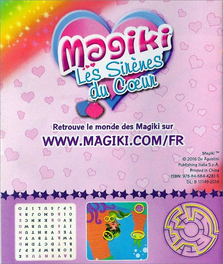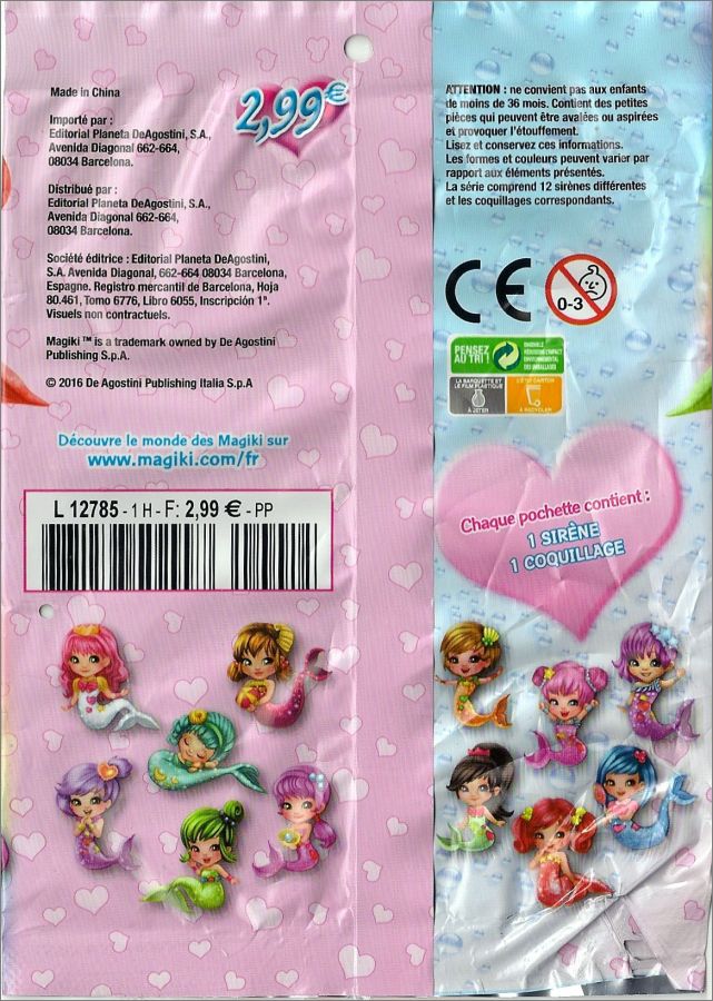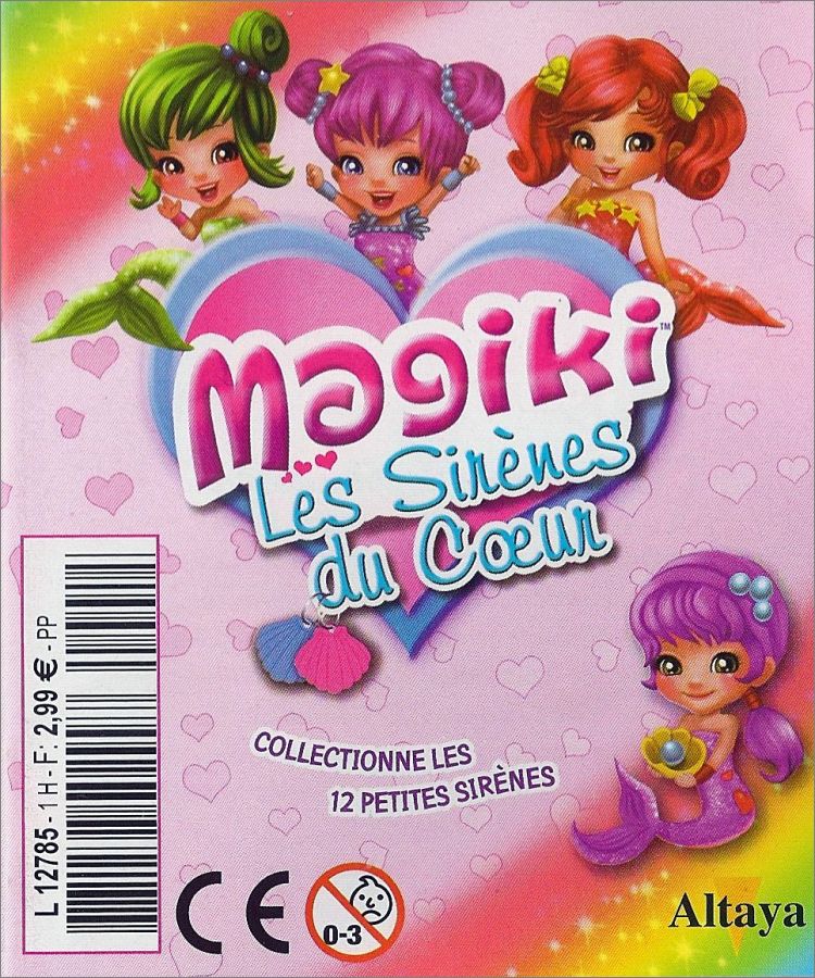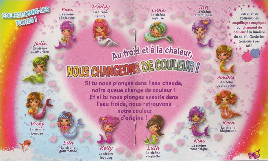 Chaque pochette contient une figurine (La queue de la sirène change de couleur au contact de l'eau chaude (devient blanche), et reprend sa couleur initiale au contact de l'eau froide), un coquillage (blanc qui change de couleur à la lumière du soleil) et un petit livret personnalisé de détails et de jeux sur la sirèneDétail des figurines