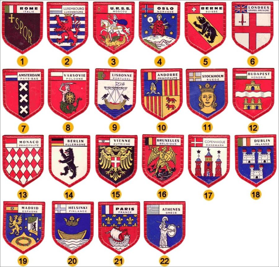 22 écussons des grandes capitales européennes de l'époque offerts par Danone dans les années 70.