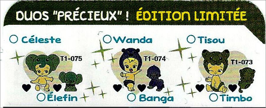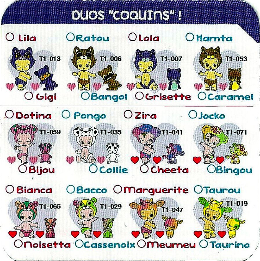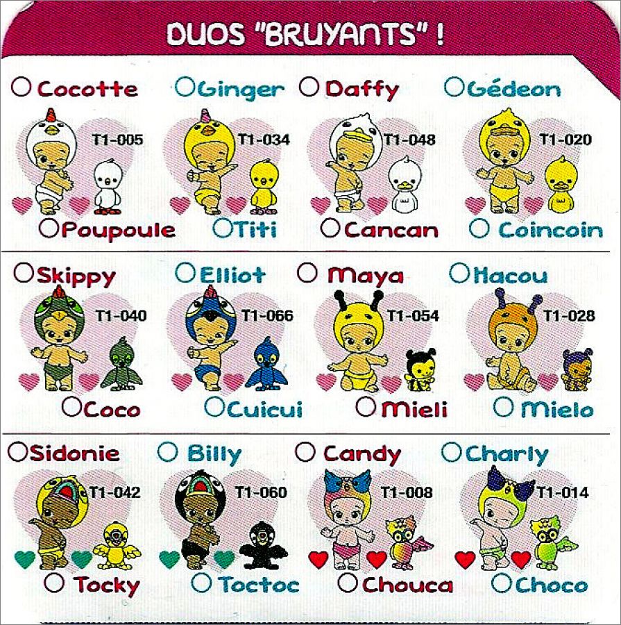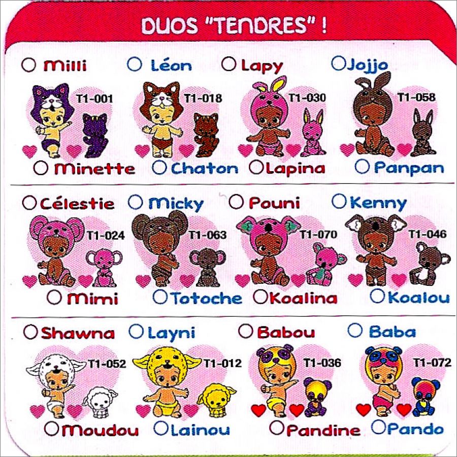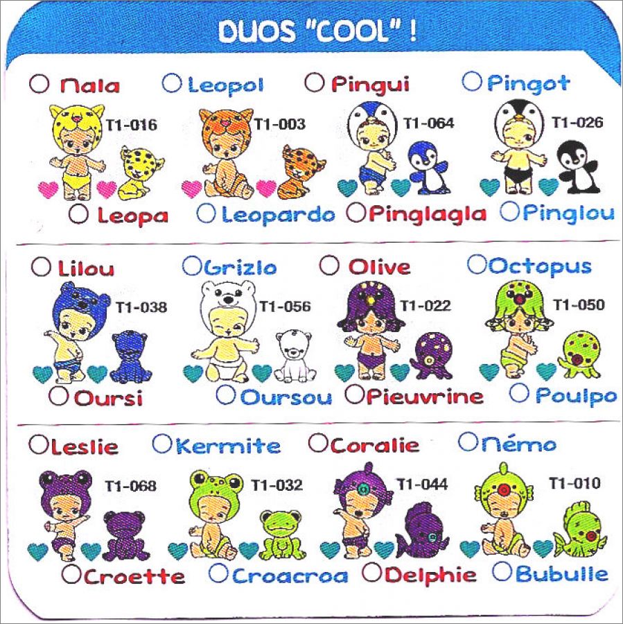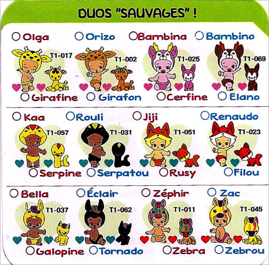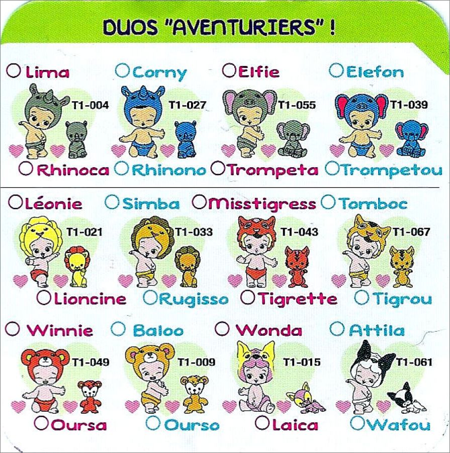 Un bébé et son animal associé, ce sont ou des filles ou des garçons, divisées en 7 familles avec des types :classique, rare, ultra-rare et édition limitée.