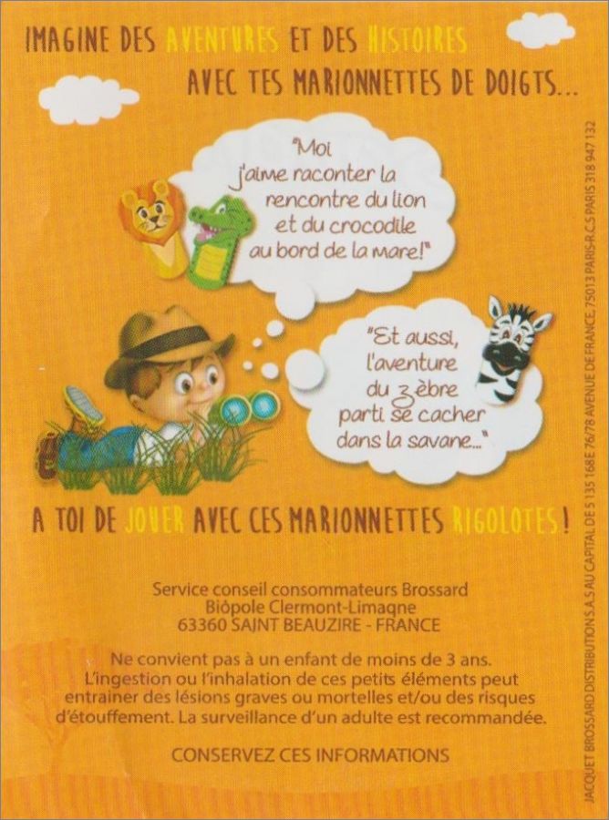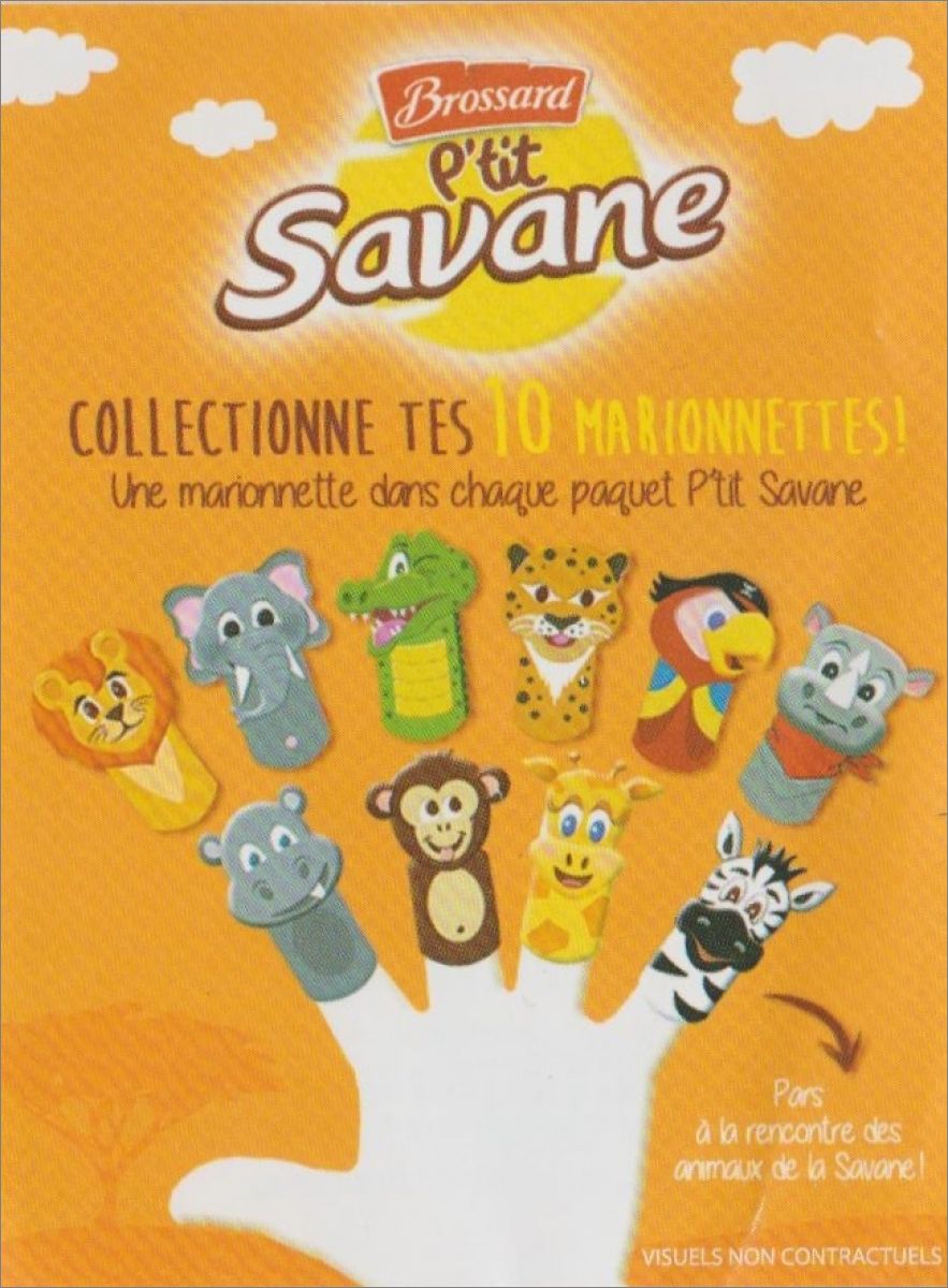 10 Marionnettes de doigts en carton à collectionner dans les boites de : Brossard p'tit savane chocolat, ou tout chocolat ou fraise (la boite est orange)