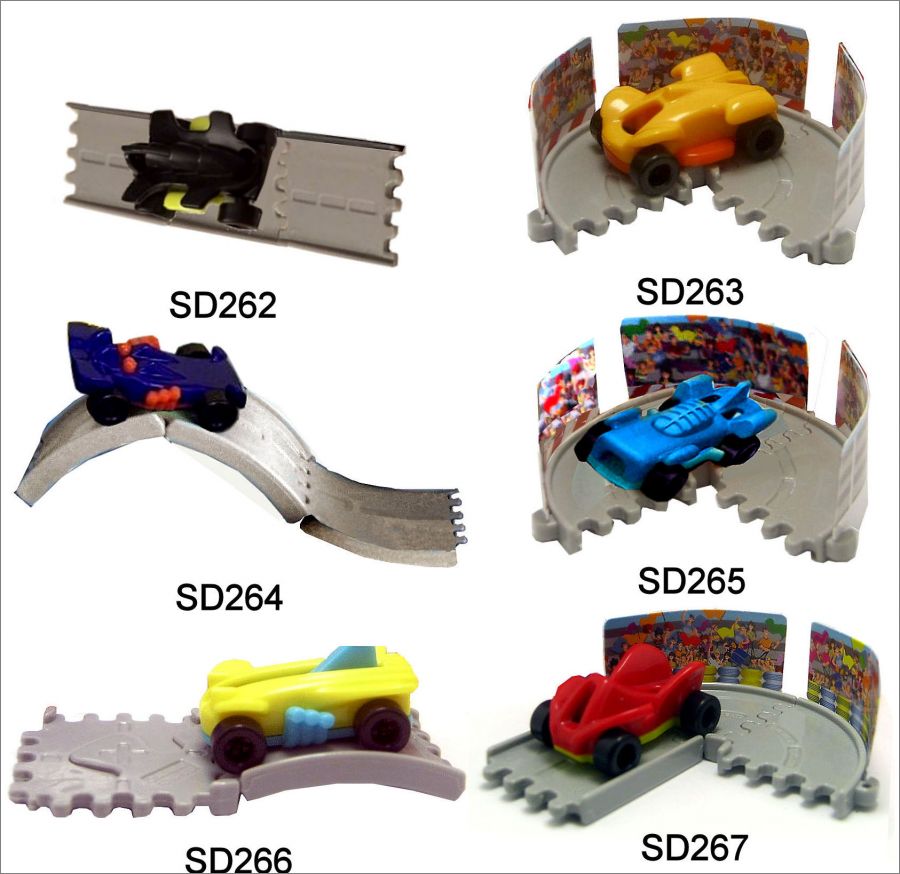 SD262 : Voiture noire avec 3 parties de piste droite = 262 SD263 : Voiture orange avec 3 parties de piste en quartier de cercle = 263 SD264 : Voiture bleue foncée avec 3 parties de piste cintré = 264 SD265 : Voiture bleue clair avec 3 parties de piste en quartier de cercle = 265 SD266 : Voiture jaune avec 1 partie de piste cintré et 2 raccords = 266 SD267 : Voiture rouge avec 1 parties de piste droite et 2 en quartier de cercle = 267