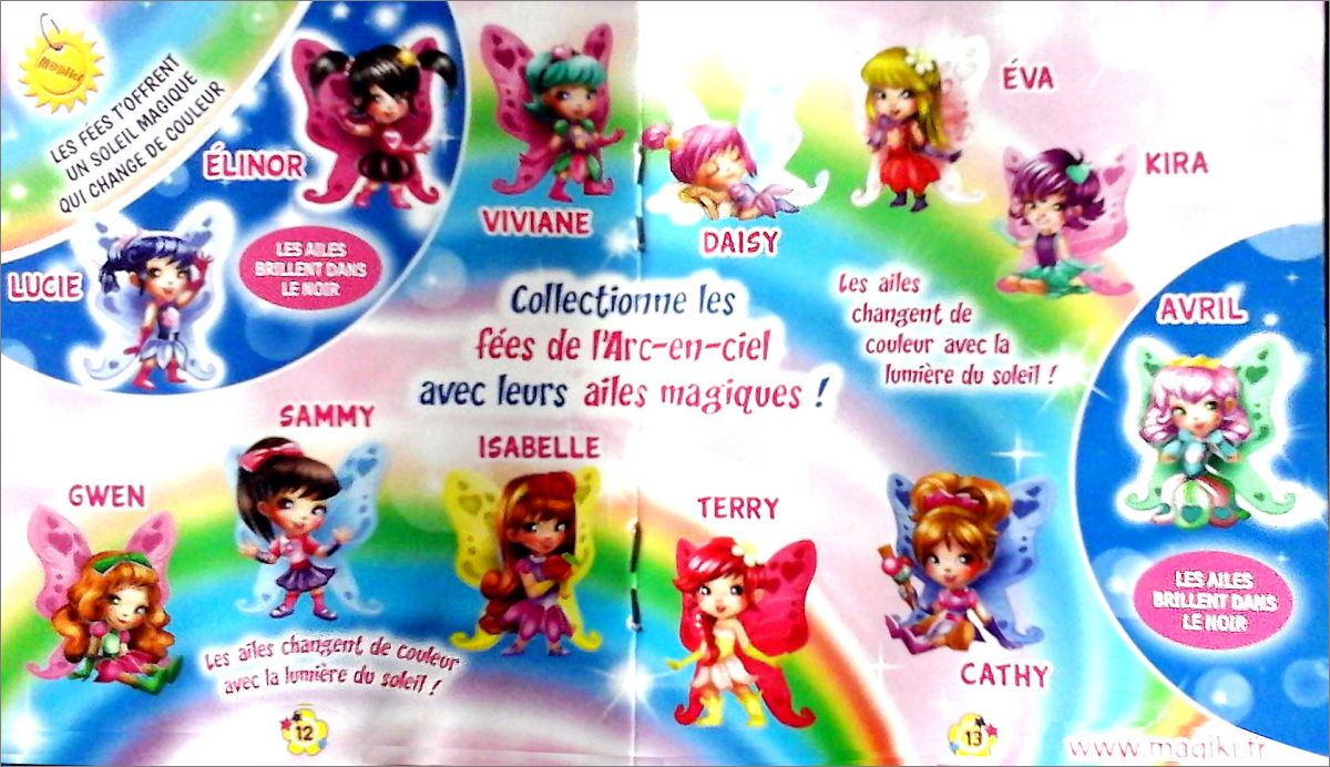 Chaque pochette contient une fée + un soleil qui change de couleur...Au soleil ! Le pouvoir de ces fées de l'arc-en-ciel réside dans leurs ailes. En effet, trois fées de la collection voient leurs ailes briller dans le noir, tandis que les autres ont leur ailes qui changent de couleur à la lumière du soleil ! Effet phosphorescent ou changement en fonction de la température, ce sera la surprise Détail des figurines :