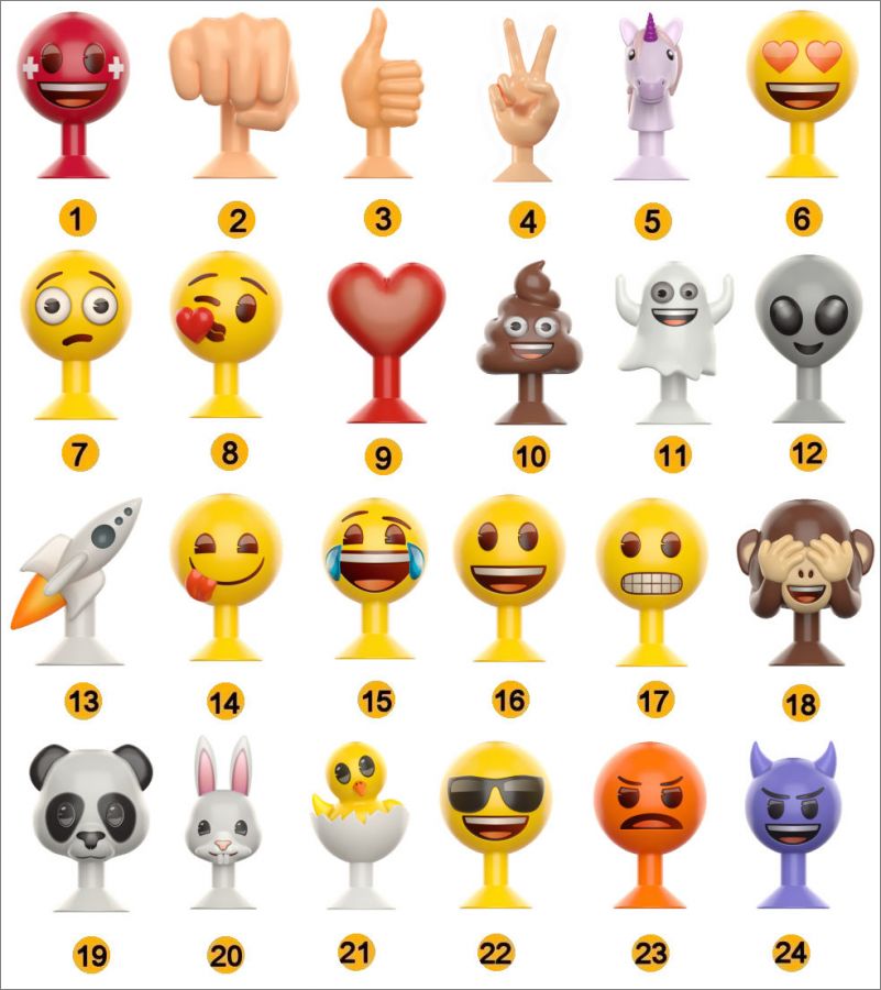 24 emoji™ rigolos à collectionner et à échanger t'attendent! Les emoji™ sont des figurines en plastique dotées d'une ventouse, également appelées stuxx, qui te permettent d'exprimer tes sentiments. Content? Mal luné? Dis-le avec tes emoji™: plus tu en auras, plus la palette de sentiments que tu pourras exprimer sera grande! En ce moment dans les supermarchés Coop, les Coop City, les Coop Brico+Loisirs, les restaurants Coop et sur coop@home.