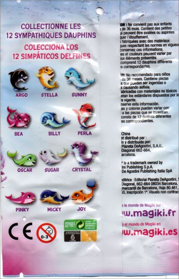 Chaque pochette contient un dauphin + une clé Quand on plonge les dauphins dans l'eau froide ils changent de couleur...quand on les replonge dans l'eau chaude ils reprennent leur couleur d'origineDétail des figurines :