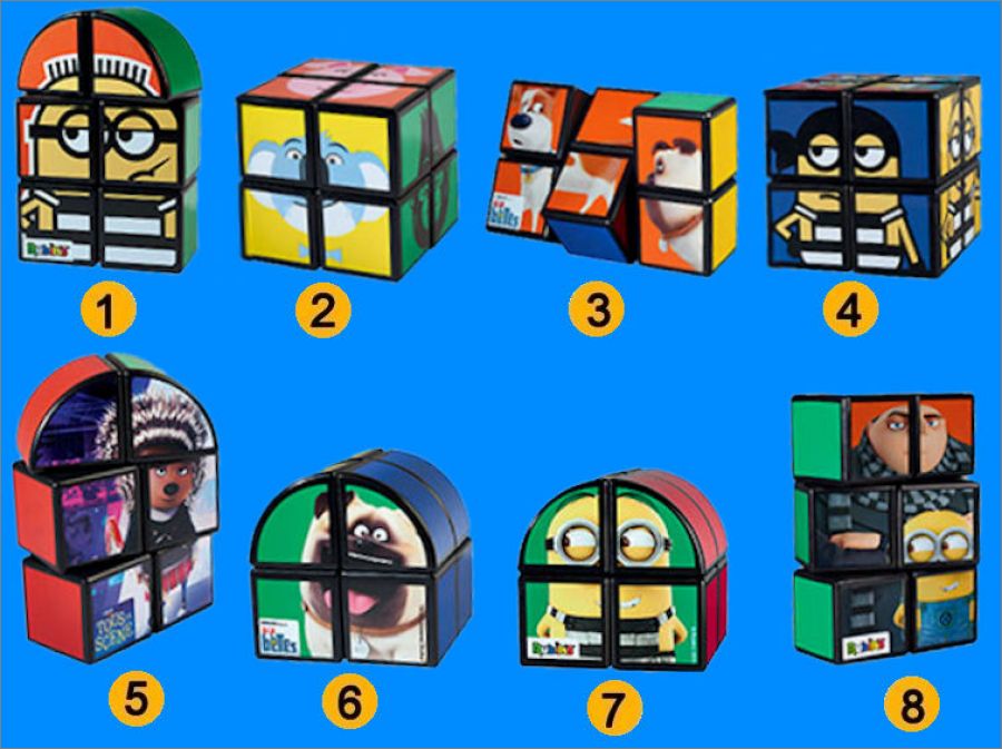 collectionne les 8 Rubik's Cube dans ton menu happy Meal McDonald's en France ! Ils sont à l'effigie des personnages des films : " Moi moche et méchant 3", "Tous en Scène" et "Comme des Bêtes"