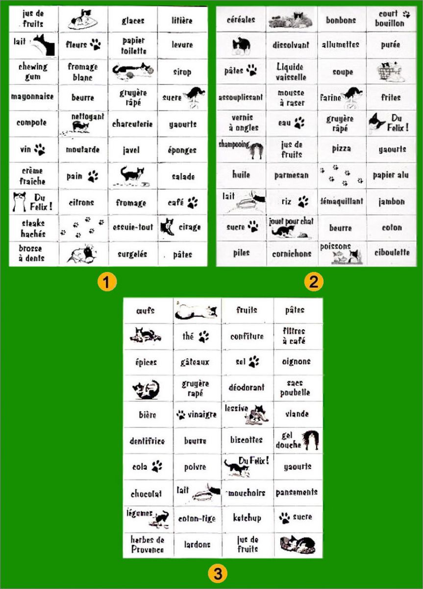 Félix (Purina) : 1 à 3 (suivre la numérotation sur l'image)