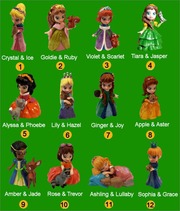 Chaque pochette contient une figurine accompagnée de son livret au prix de 2.99€, leurs robes ont des paillettesDétail des figurines :