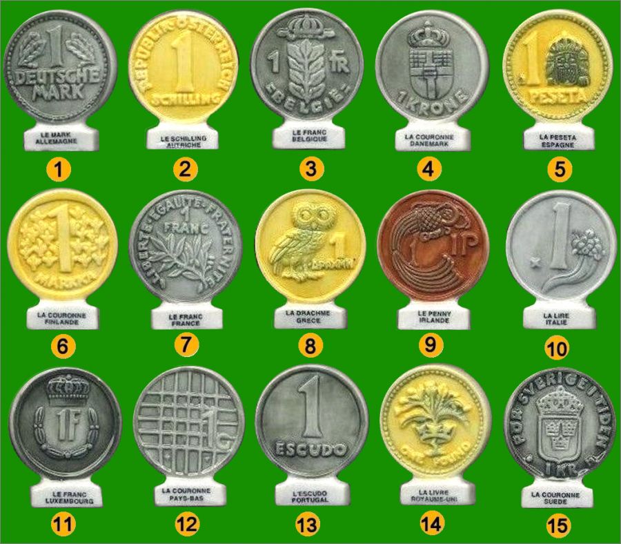 Collection de 15 fèves de 15 pays avec leur monnaie avant le passage à l'euro